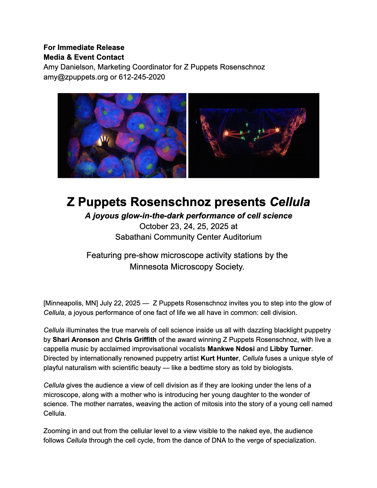 Cellula is a 50-minute performance combining blacklight puppetry and live vocal music. The show travels in a van and two cars with four performers and a sound/lighting technician who will also load-in and set up. The performers include two vocalists (enter SL and SR, sit onstage left or in pit) and two puppeteers.