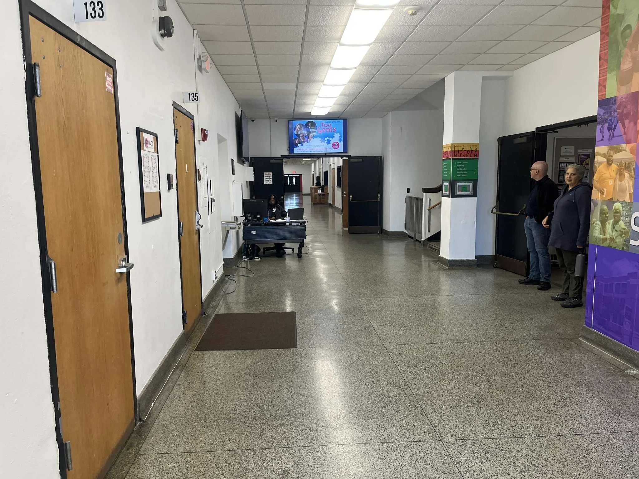 Once you enter that door, there will be a big hallway with a security guard at a desk. The auditorium is straight down the hall from the security desk.